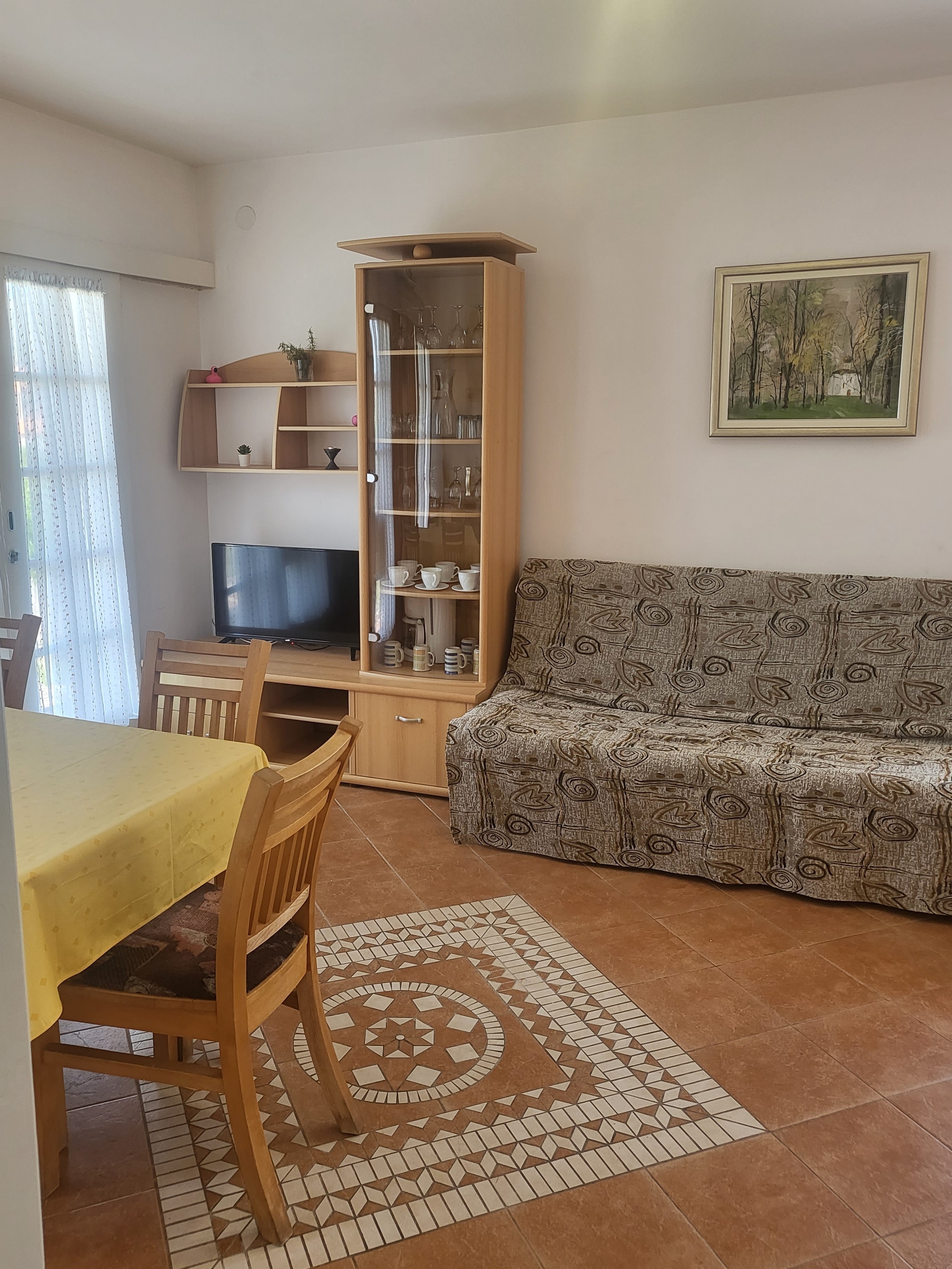 Apartment can accommodate 5 guests. Beds are situated in 2 sleeping rooms, but also in the dining room, within 45m2. Guests can use a private terrace to enjoy the warm summer evenings. The apartment offers the sea view. Food can be prepared using barbecue which is shared with other guests too. This accommodation unit welcomes pets at an additional charge. Other guests or hosts pass through the terrace of the booked accommodation unit. INCLUDED IN THE PRICE: final cleaning, air-conditioning, parking, internet, baby cot, iron, ironing board, hairdryer. OBLIGATORY ADDITIONAL COSTS: tourist tax (adults €0.93 - €2.00 nightperson, discount for children aged 12 - 17), short stay fee (surcharge depending on a number of booked nights: 30% - 1, 20% - 2, 10% - 3). OPTIONAL ADDITIONAL COSTS: pets (€12.00 per night). The availability of additional services for your chosen dates of stay, as well as their prices (if none are listed) must be checked ahead of time. Any additional services not shown in the price calculation are payable directly to the property owner and only if used by the visitor.