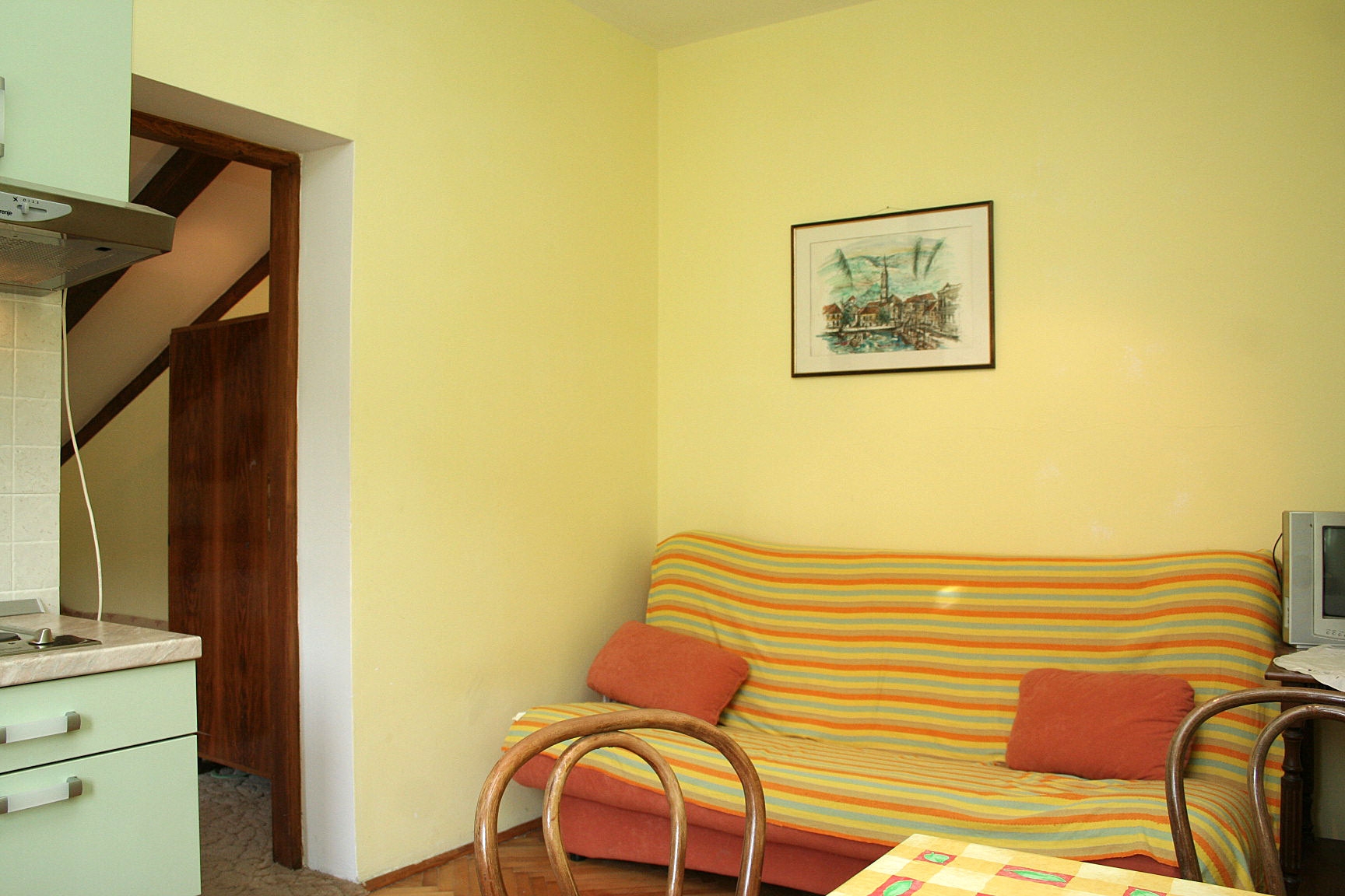 Apartment can accommodate 4 guests. Beds are situated in 1 sleeping rooms, but also in the dining room, within 27m2. Guests can use a private balcony to enjoy the warm summer evenings. Food can be prepared using barbecue which is shared with other guests too. This accommodation unit welcomes pets at an additional charge. INCLUDED IN THE PRICE: tourist tax, final cleaning, parking, internet, iron, ironing board, hairdryer. OBLIGATORY ADDITIONAL COSTS: short stay fee (surcharge depending on a number of booked nights: 30% - 1, 20% - 2, 10% - 3). OPTIONAL ADDITIONAL COSTS: air-conditioning (€5.00 per night), laundry (€5.00 washing), pets (€5.00 per night). The availability of additional services for your chosen dates of stay, as well as their prices (if none are listed) must be checked ahead of time. Any additional services not shown in the price calculation are payable directly to the property owner and only if used by the visitor.