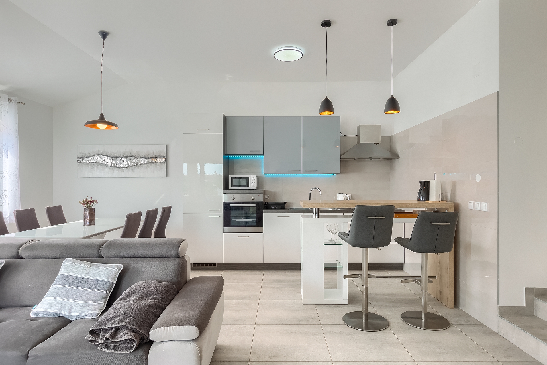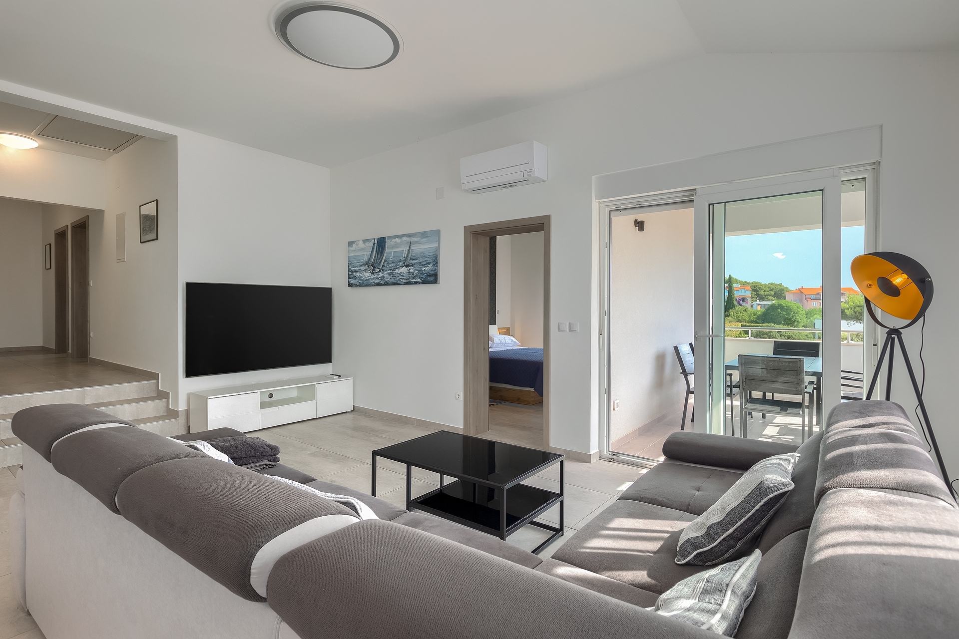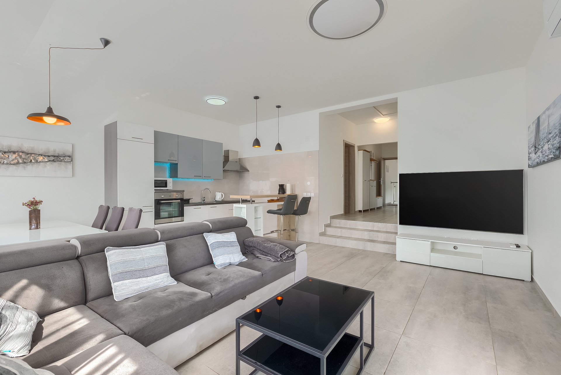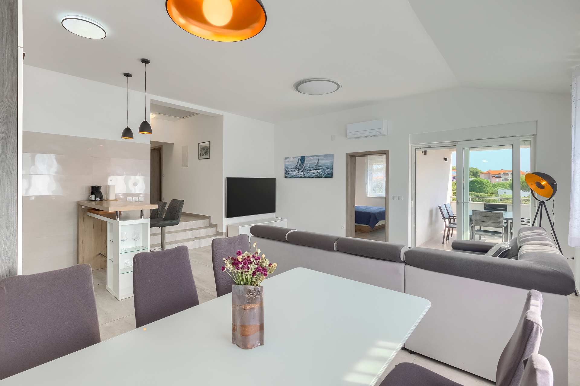 Apartment can accommodate 5 guests. Beds are situated in 2 sleeping rooms, but also in the living room, within 77m2. Guests can use a private terrace to enjoy the warm summer evenings. Food can be prepared using barbecue which is shared with other guests too. Shared pool is on disposal during stay. For the booked accommodation unit the deposit is paid directly to the owner upon check-in (deposit amount is displayed on the website) INCLUDED IN THE PRICE: tourist tax, final cleaning, air-conditioning, pool, parking, internet, baby cot, hairdryer. OBLIGATORY ADDITIONAL COSTS: deposit (€200.00 one-time payment). The availability of additional services for your chosen dates of stay, as well as their prices (if none are listed) must be checked ahead of time. Any additional services not shown in the price calculation are payable directly to the property owner and only if used by the visitor.