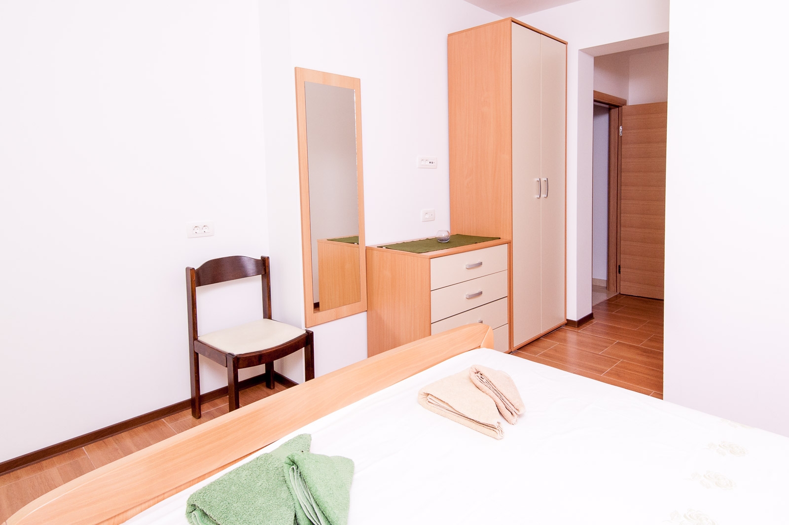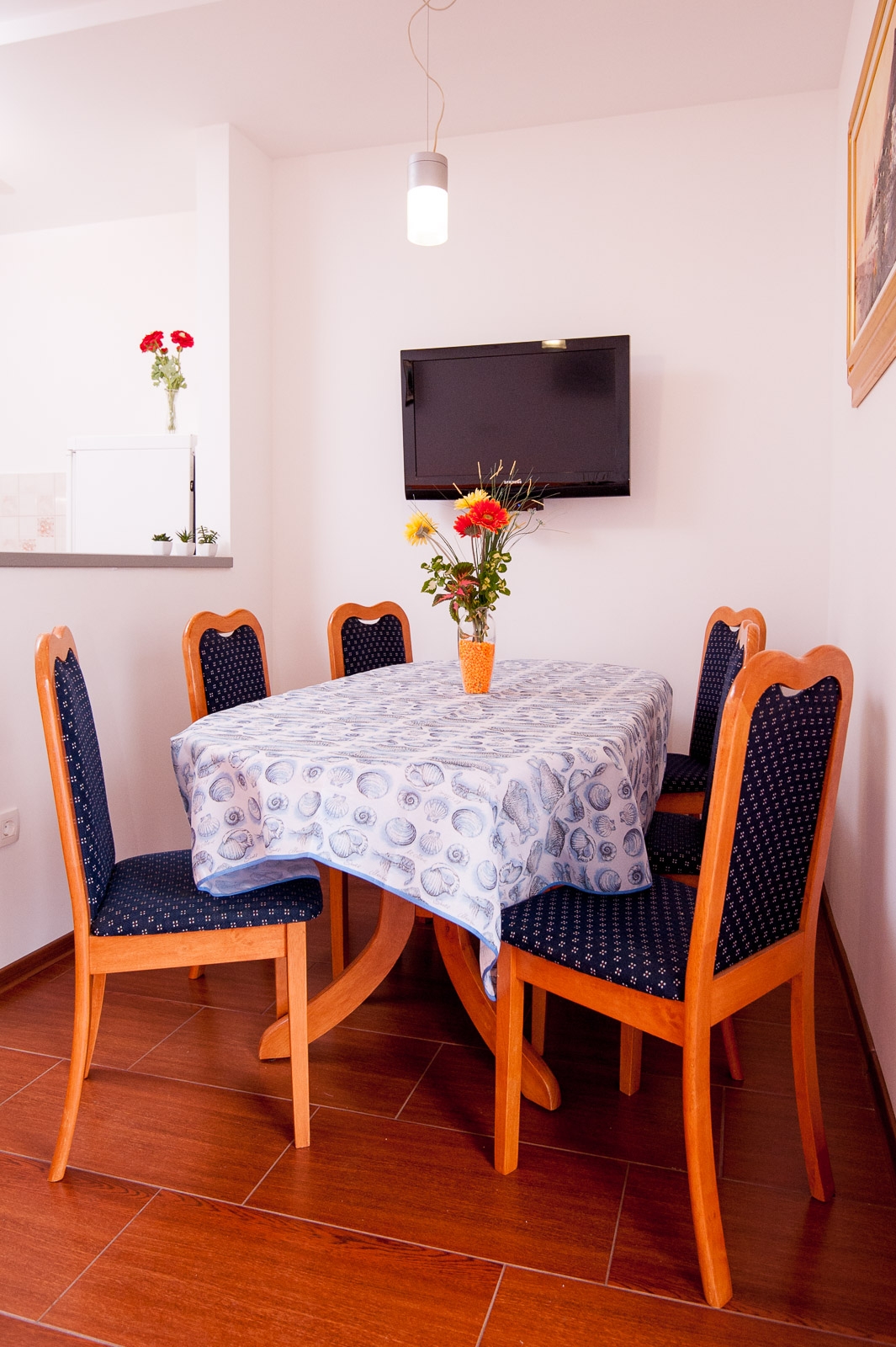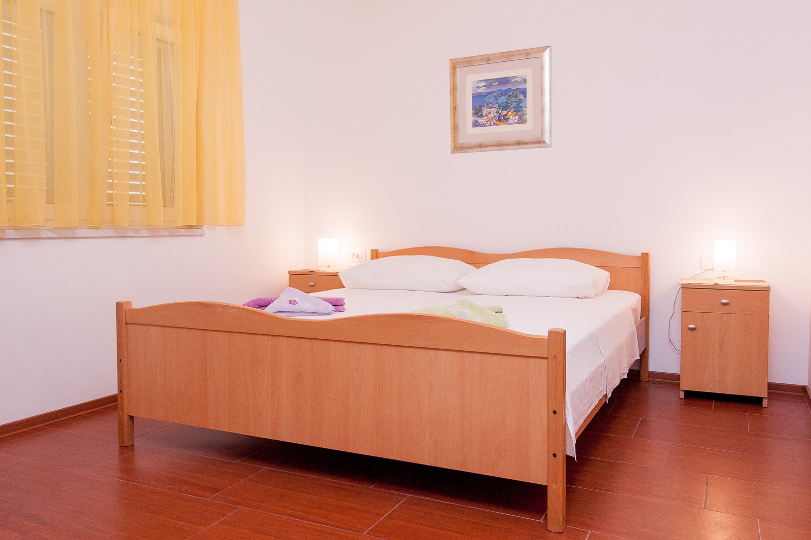 Apartment can accommodate 8 guests. Beds are situated in 3 sleeping rooms, but also in the dining room, within 75m2. Guests can use a private terrace to enjoy the warm summer evenings. The apartment offers the sea view. For full enjoyment and relaxation there is a private barbecue for this accommodation guests only. INCLUDED IN THE PRICE: tourist tax, final cleaning, air-conditioning, parking, internet, baby cot, iron, ironing board, hairdryer, portable barbecue. OBLIGATORY ADDITIONAL COSTS: short stay fee (surcharge depending on a number of booked nights: 30% - 1, 20% - 2, 10% - 3). OPTIONAL ADDITIONAL COSTS: additional bed (€15.00 per night). The availability of additional services for your chosen dates of stay, as well as their prices (if none are listed) must be checked ahead of time. Any additional services not shown in the price calculation are payable directly to the property owner and only if used by the visitor.