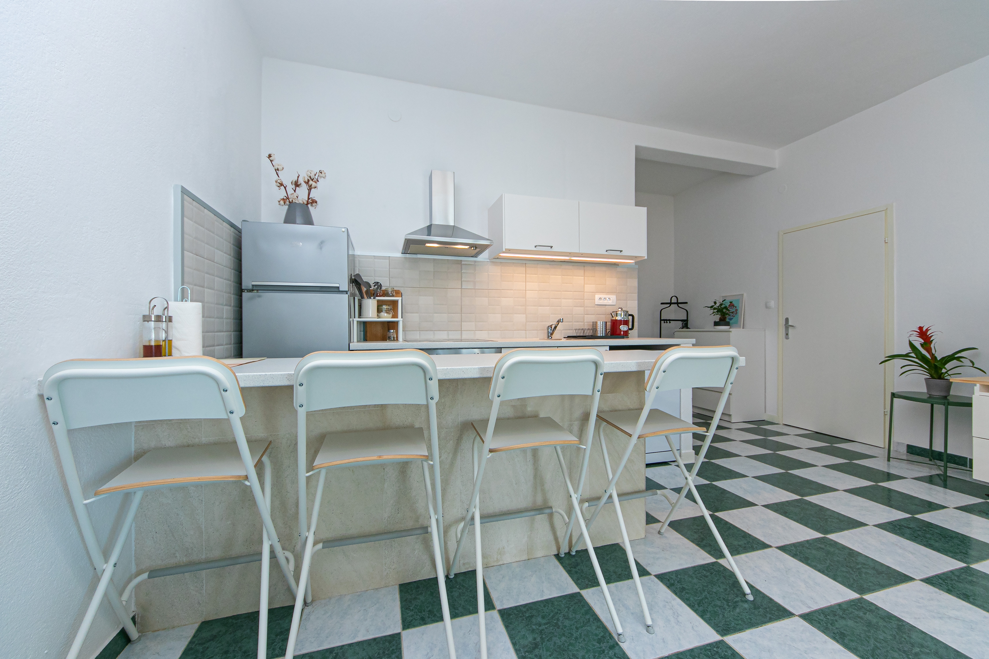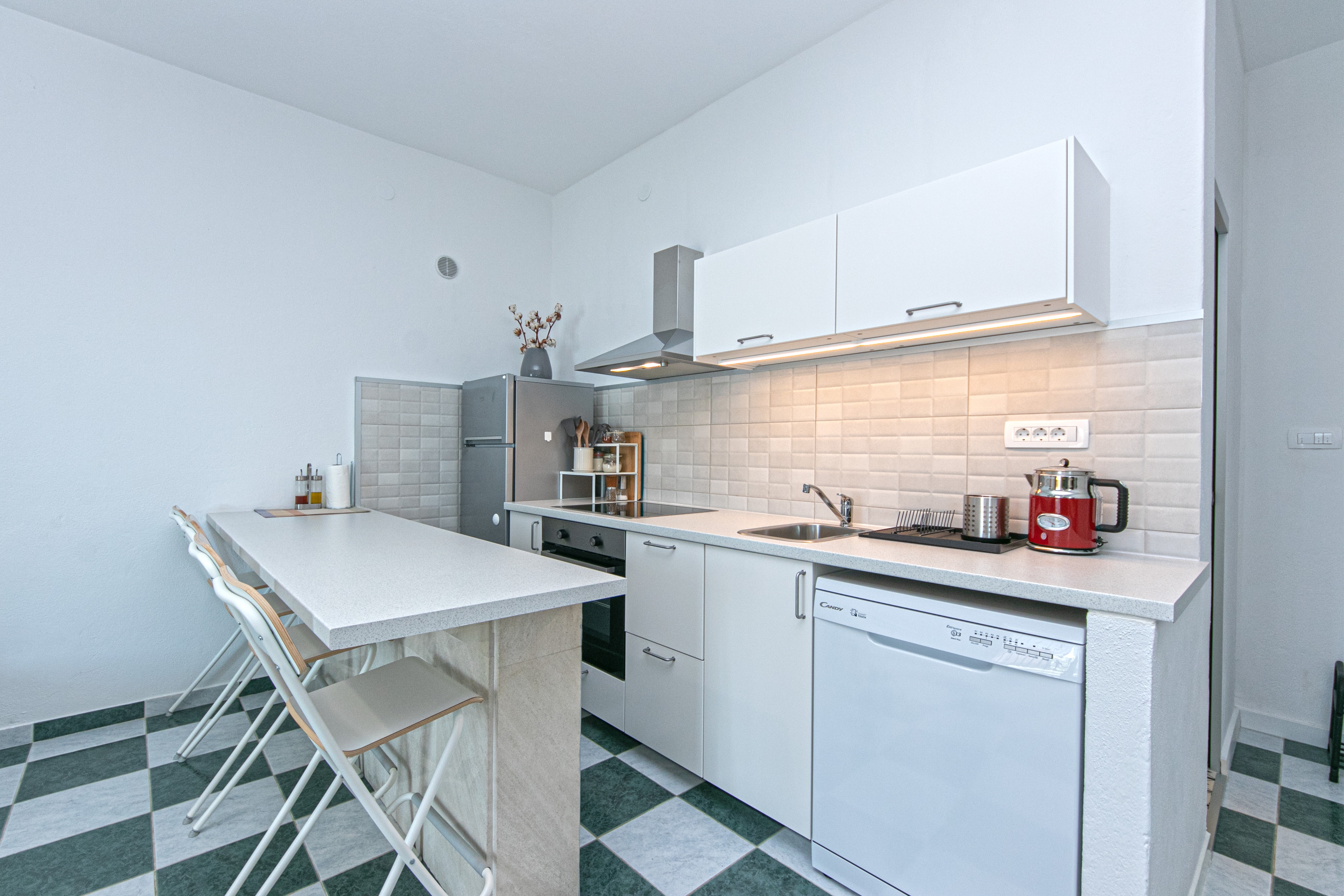 Apartment can accommodate 6 guests. Beds are situated in 2 sleeping rooms, but also in the living room, within 49m2. Guests can use a private terrace to enjoy the warm summer evenings. The apartment offers the sea view. Food can be prepared using barbecue which is shared with other guests too. This accommodation unit welcomes pets at an additional charge. INCLUDED IN THE PRICE: tourist tax, final cleaning, air-conditioning, parking, garage, internet, laundry, baby cot, iron, ironing board, hairdryer, sunshade. OPTIONAL ADDITIONAL COSTS: pets (€7.00 per night), additional bed (€25.00 per night). The availability of additional services for your chosen dates of stay, as well as their prices (if none are listed) must be checked ahead of time. Any additional services not shown in the price calculation are payable directly to the property owner and only if used by the visitor. Discounts to the base price: free day 14=13 (for reservations of 14 or more days you get one free day for the stay until 31122026).