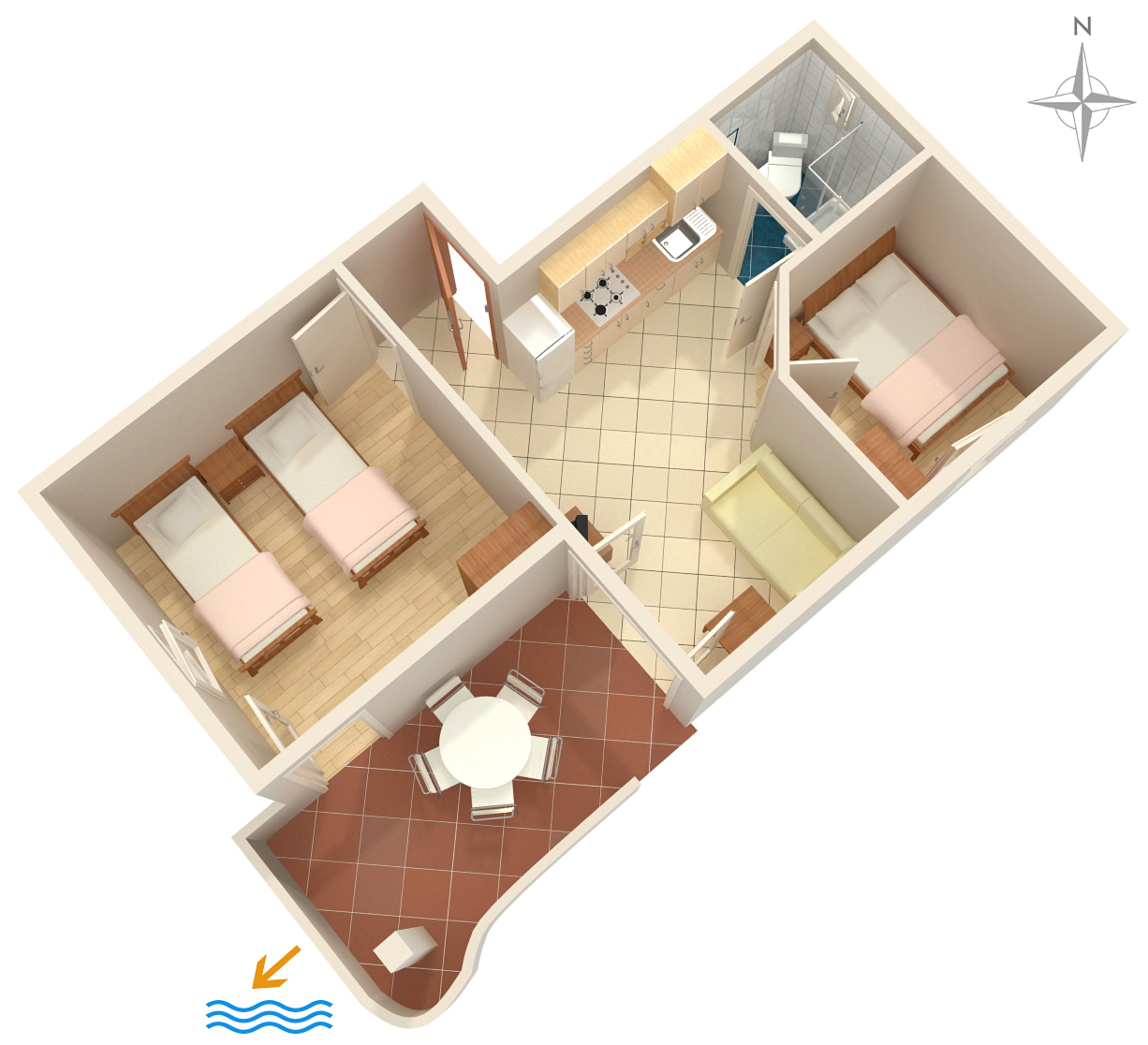 Apartment can accommodate 6 guests. Beds are situated in 2 sleeping rooms, but also in the living room, within 37m2. Guests can use a private terrace to enjoy the warm summer evenings. Food can be prepared using barbecue which is shared with other guests too. This accommodation unit welcomes pets at an additional charge. INCLUDED IN THE PRICE: tourist tax, final cleaning, air-conditioning, parking, internet, baby cot, ironing board, hairdryer. OBLIGATORY ADDITIONAL COSTS: short stay fee (surcharge depending on a number of booked nights: 30% - 1, 20% - 2, 10% - 3). OPTIONAL ADDITIONAL COSTS: pets (€5.00 per night). The availability of additional services for your chosen dates of stay, as well as their prices (if none are listed) must be checked ahead of time. Any additional services not shown in the price calculation are payable directly to the property owner and only if used by the visitor.