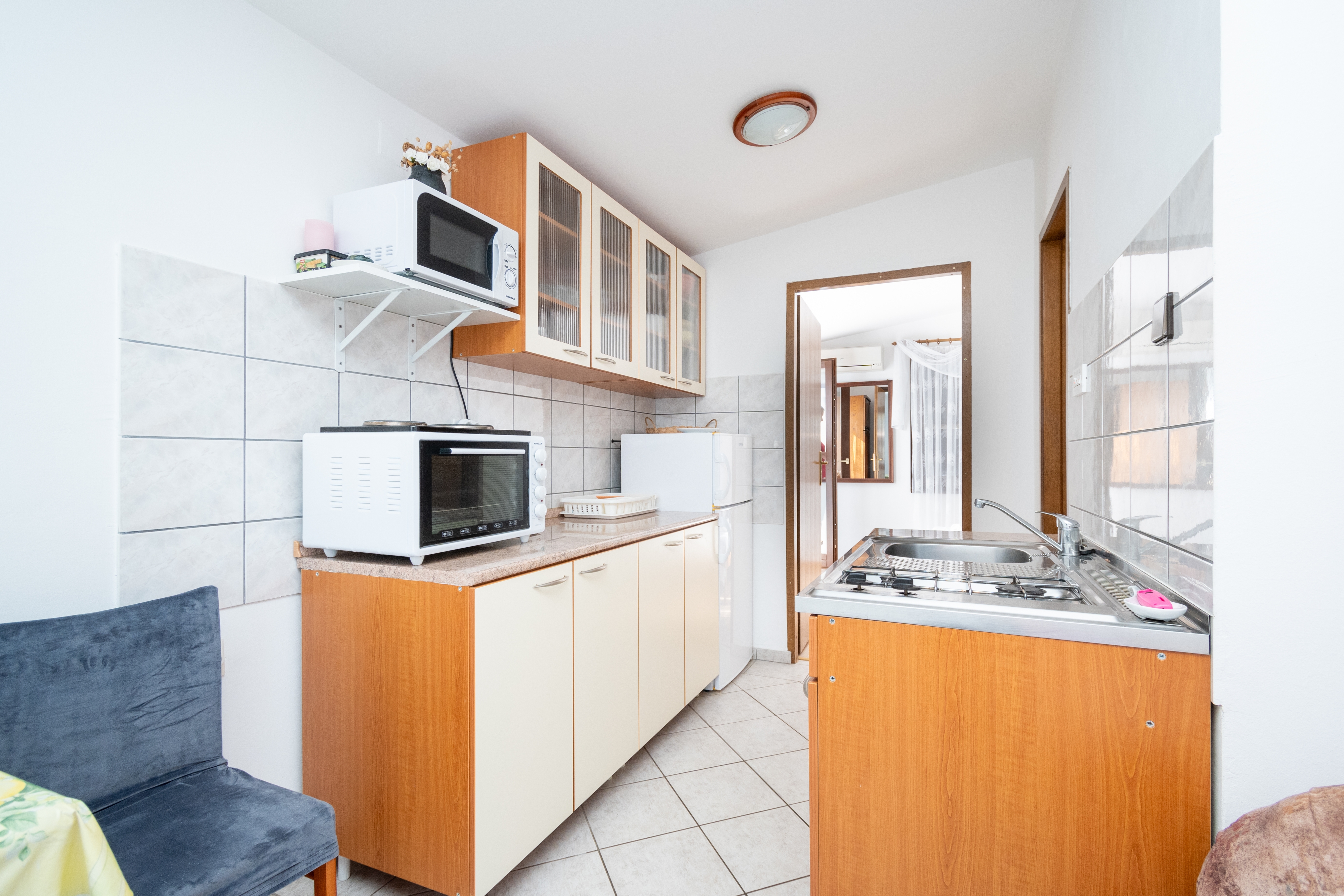 Apartment can accommodate 4 guests. Beds are situated in 1 sleeping rooms, but also in the living room, within 33m2. Guests can use a private terrace to enjoy the warm summer evenings. Food can be prepared using barbecue which is shared with other guests too. INCLUDED IN THE PRICE: tourist tax, final cleaning, air-conditioning, parking, internet, iron, ironing board, hairdryer. OPTIONAL ADDITIONAL COSTS: laundry (€5.00 washing). The availability of additional services for your chosen dates of stay, as well as their prices (if none are listed) must be checked ahead of time. Any additional services not shown in the price calculation are payable directly to the property owner and only if used by the visitor. Discounts to the base price: free day 14=13 (for reservations of 14 or more days you get one free day for the stay until 31122026).