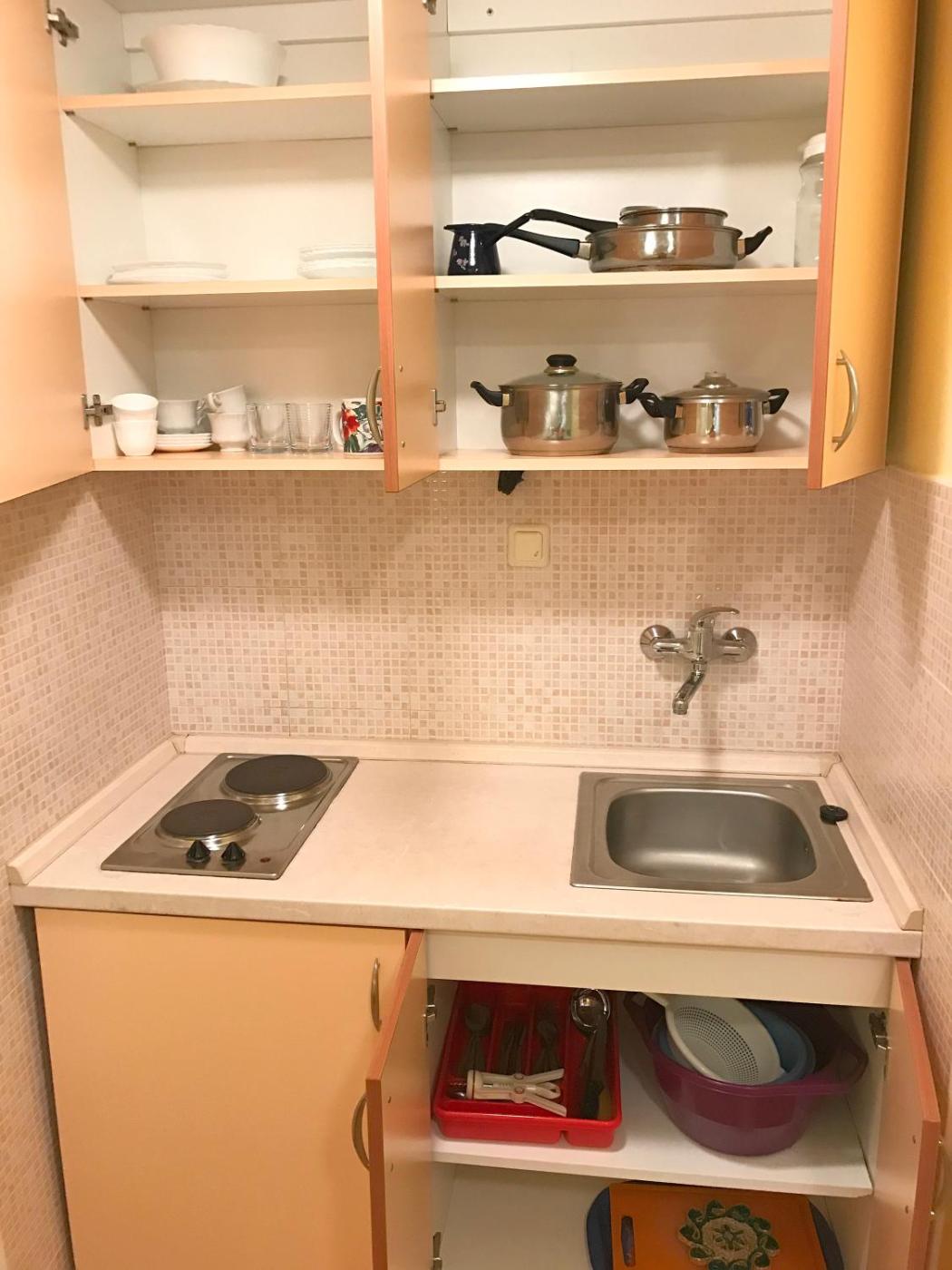 Studio. Studio apartment is situated on the first floor and accommodates 2 people in a double bed. It has a cosy room with a fully equipped kitchenette in the corner, bathroom with shower, TV, fan and terrace in front. Studio apartment for two people has sea view from terrace equipped with chairs and table. ;