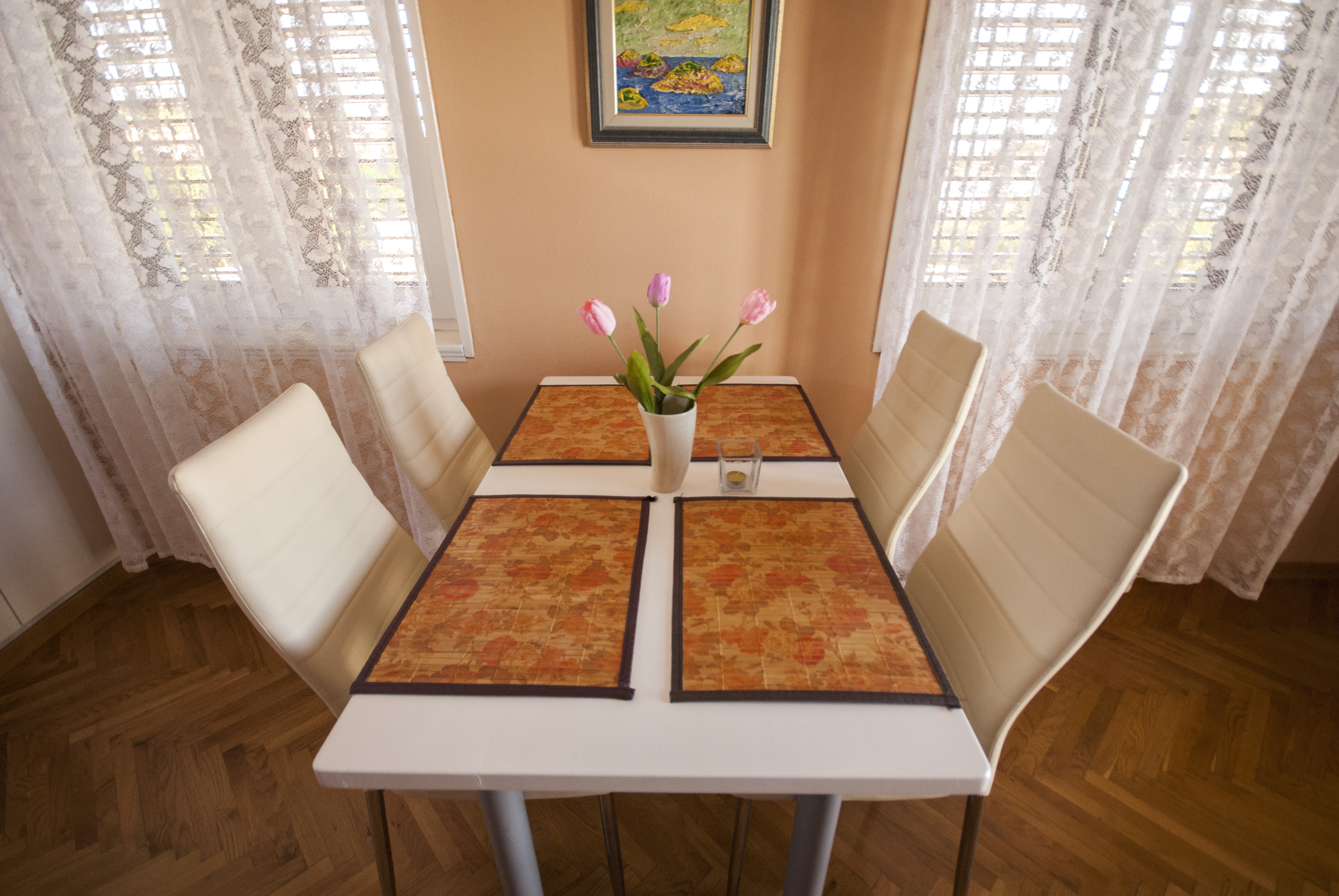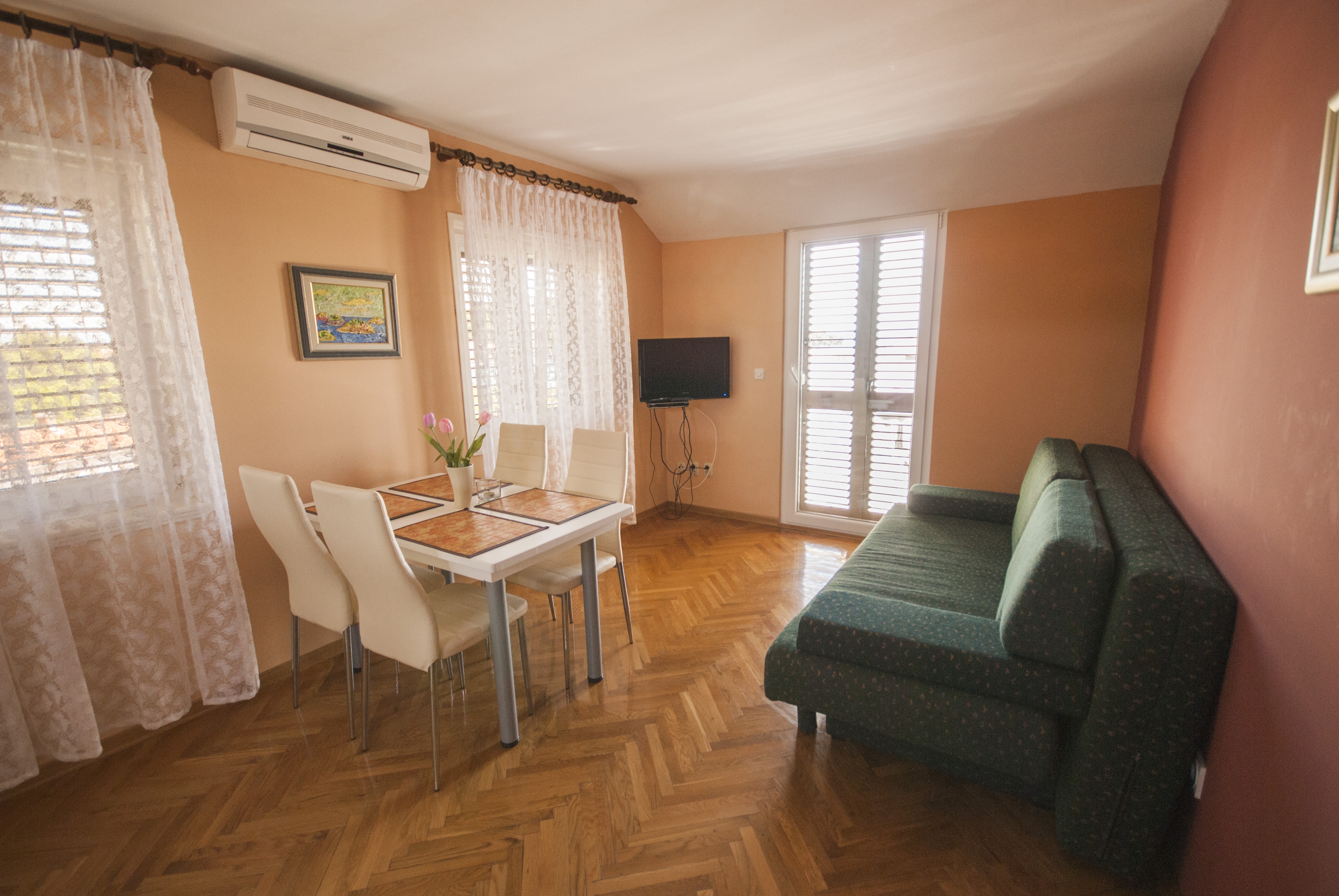 Apartment can accommodate 4 guests. Beds are situated in 1 sleeping rooms, but also in the living room, within 36m2. Guests can use a private terrace to enjoy the warm summer evenings. The apartment offers the sea view. Food can be prepared using barbecue which is shared with other guests too. This accommodation unit welcomes pets at an additional charge. INCLUDED IN THE PRICE: tourist tax, final cleaning, air-conditioning, parking, internet, laundry, iron, ironing board, hairdryer. OBLIGATORY ADDITIONAL COSTS: short stay fee (surcharge depending on a number of booked nights: 30% - 1, 20% - 2, 10% - 3). OPTIONAL ADDITIONAL COSTS: pets (€5.00 per night). The availability of additional services for your chosen dates of stay, as well as their prices (if none are listed) must be checked ahead of time. Any additional services not shown in the price calculation are payable directly to the property owner and only if used by the visitor. Discounts to the base price: free day 28=25 (for stays of 28 days or more, we give you 3 days free of charge for the stay until 31122026).