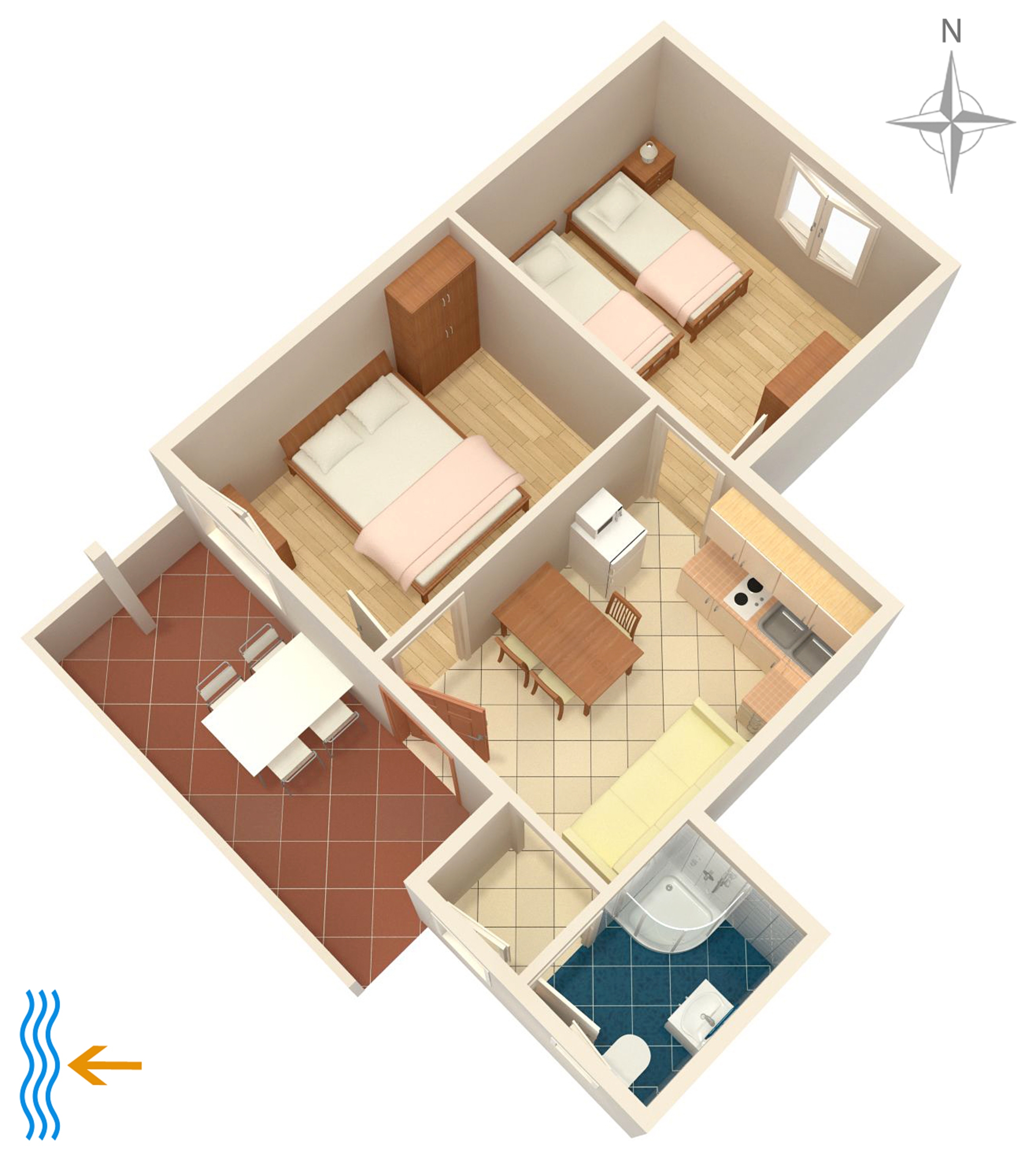 Apartment can accommodate 4 guests. Beds are situated in 2 sleeping rooms, within 34m2. Guests can use a private terrace to enjoy the warm summer evenings. Food can be prepared using barbecue which is shared with other guests too. INCLUDED IN THE PRICE: tourist tax, final cleaning, air-conditioning, parking, internet, laundry, iron, ironing board, hairdryer. OBLIGATORY ADDITIONAL COSTS: short stay fee (surcharge depending on a number of booked nights: 30% - 1, 20% - 2, 10% - 3). The availability of additional services for your chosen dates of stay, as well as their prices (if none are listed) must be checked ahead of time. Any additional services not shown in the price calculation are payable directly to the property owner and only if used by the visitor. Discounts to the base price: free day 14=13 (for reservations of 14 or more days you get one free day for the stay until 31122026).