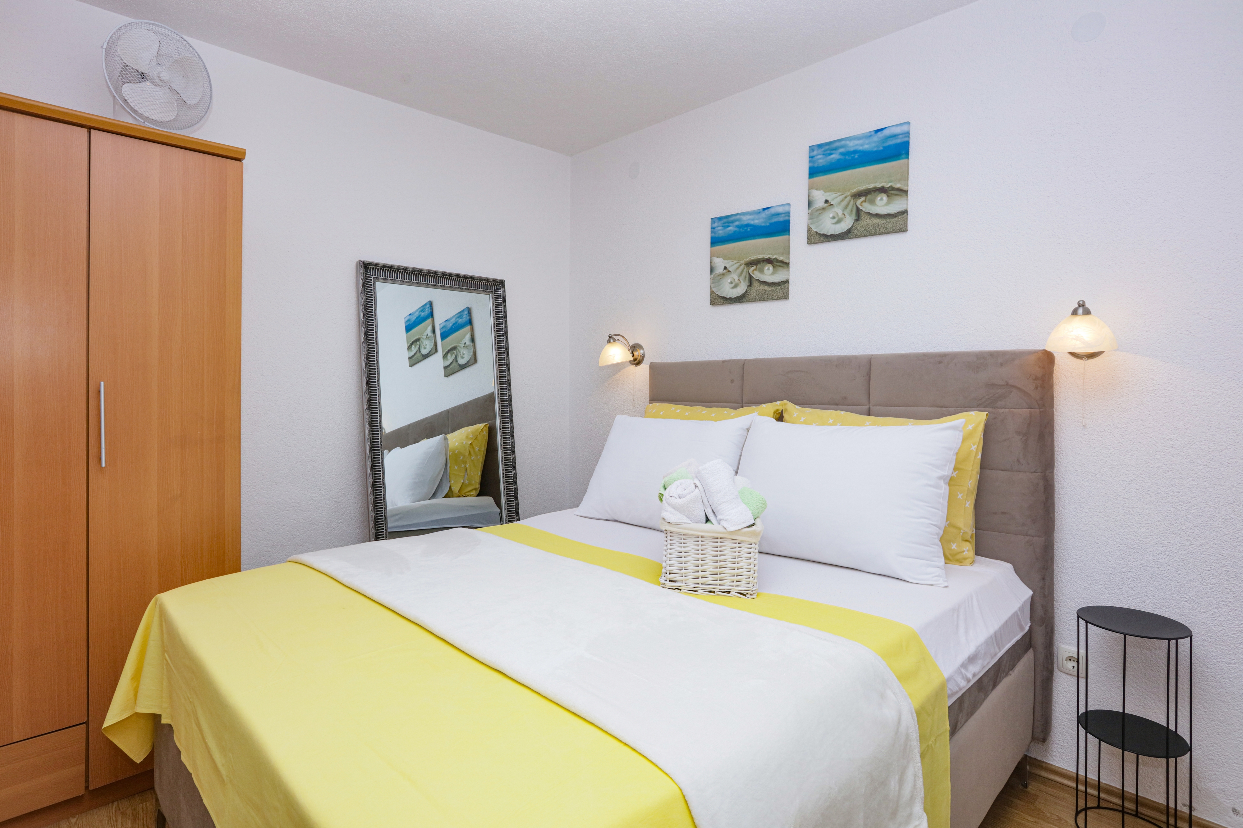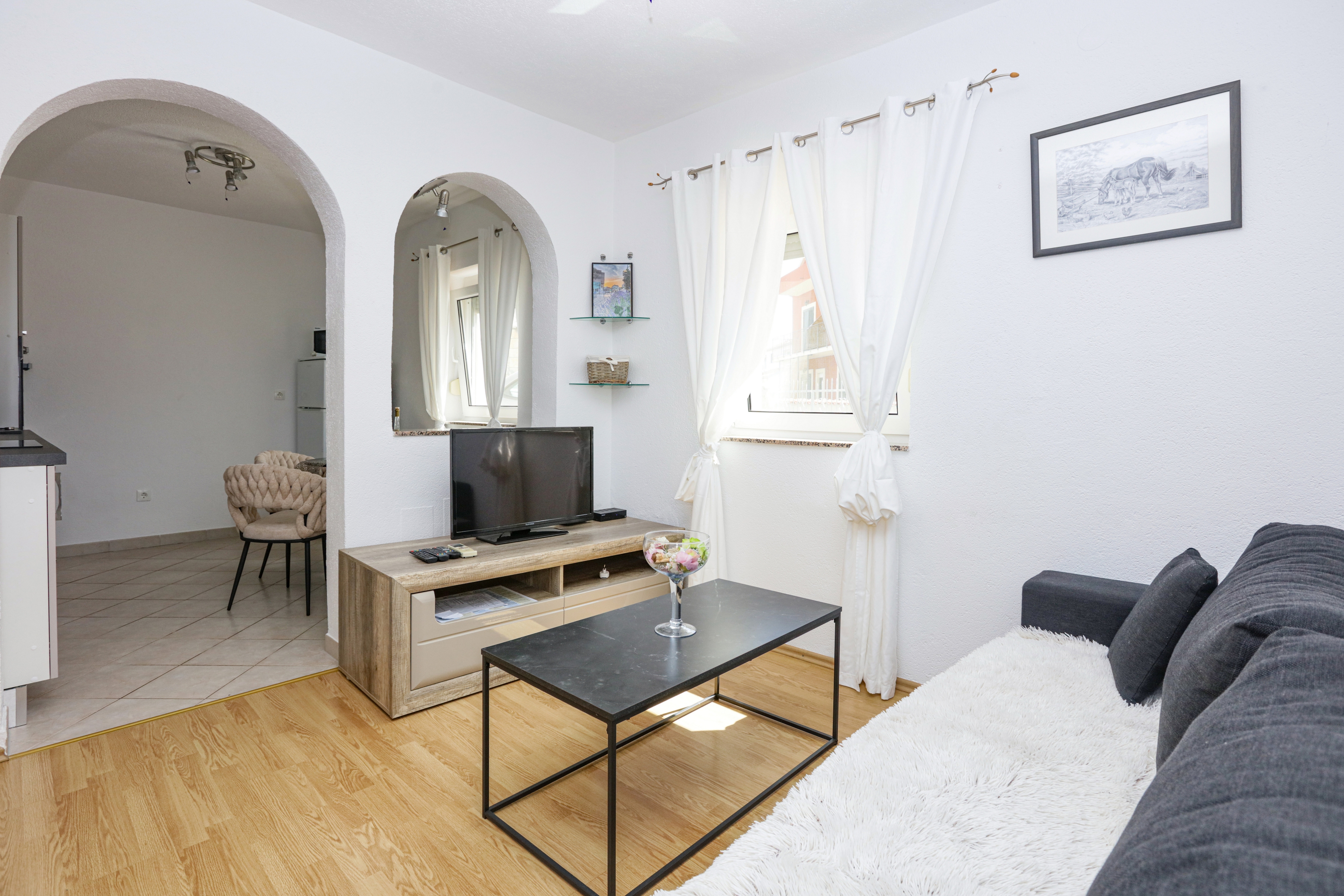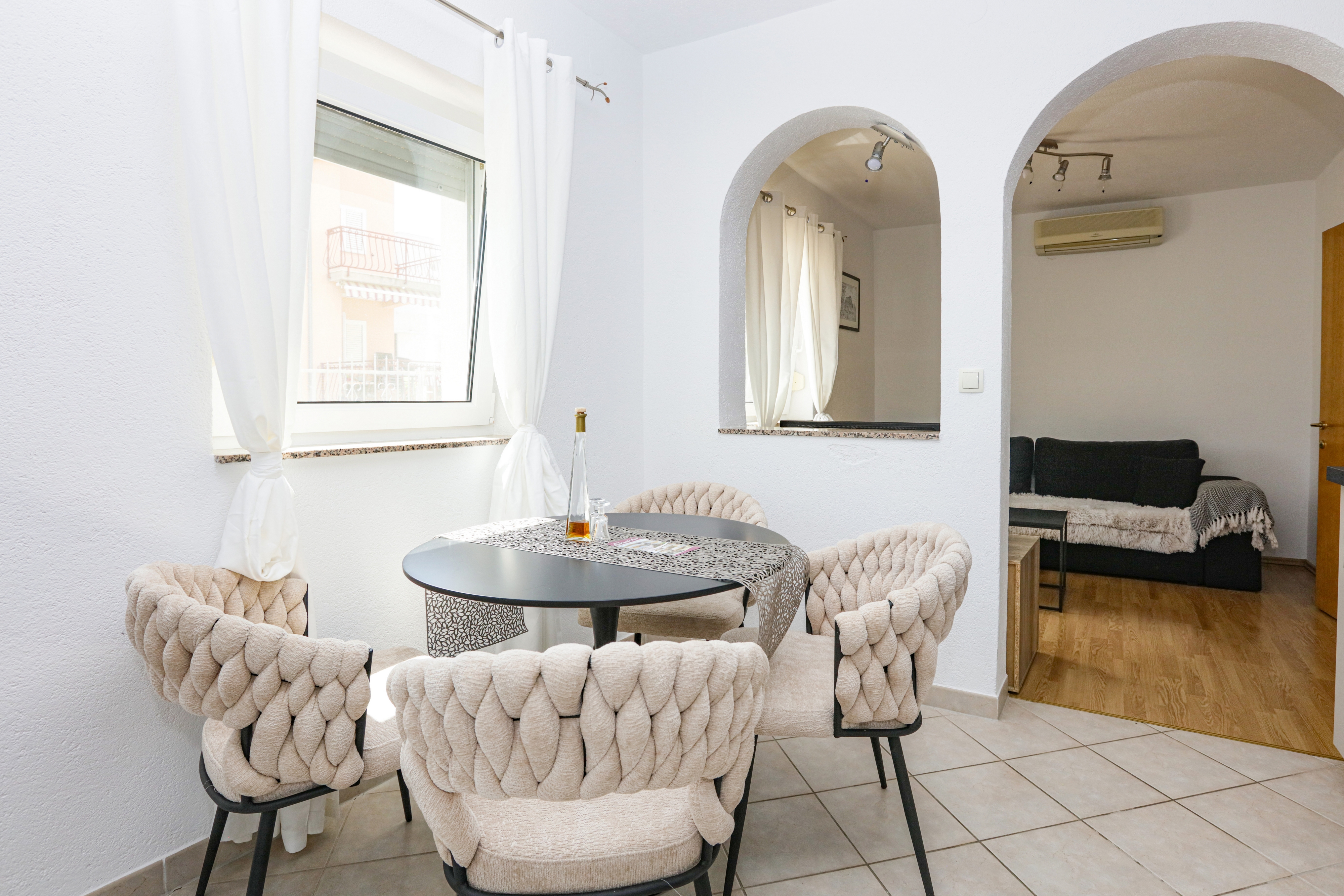 Apartment can accommodate 4 guests. Beds are situated in 1 sleeping rooms, but also in the living room, within 38m2. Guests can use a private terrace to enjoy the warm summer evenings. Some of the rooms of the accommodation unit are not connected with the rest of the unit. INCLUDED IN THE PRICE: tourist tax, final cleaning, air-conditioning, parking, internet, baby cot. The availability of additional services for your chosen dates of stay, as well as their prices (if none are listed) must be checked ahead of time. Any additional services not shown in the price calculation are payable directly to the property owner and only if used by the visitor.