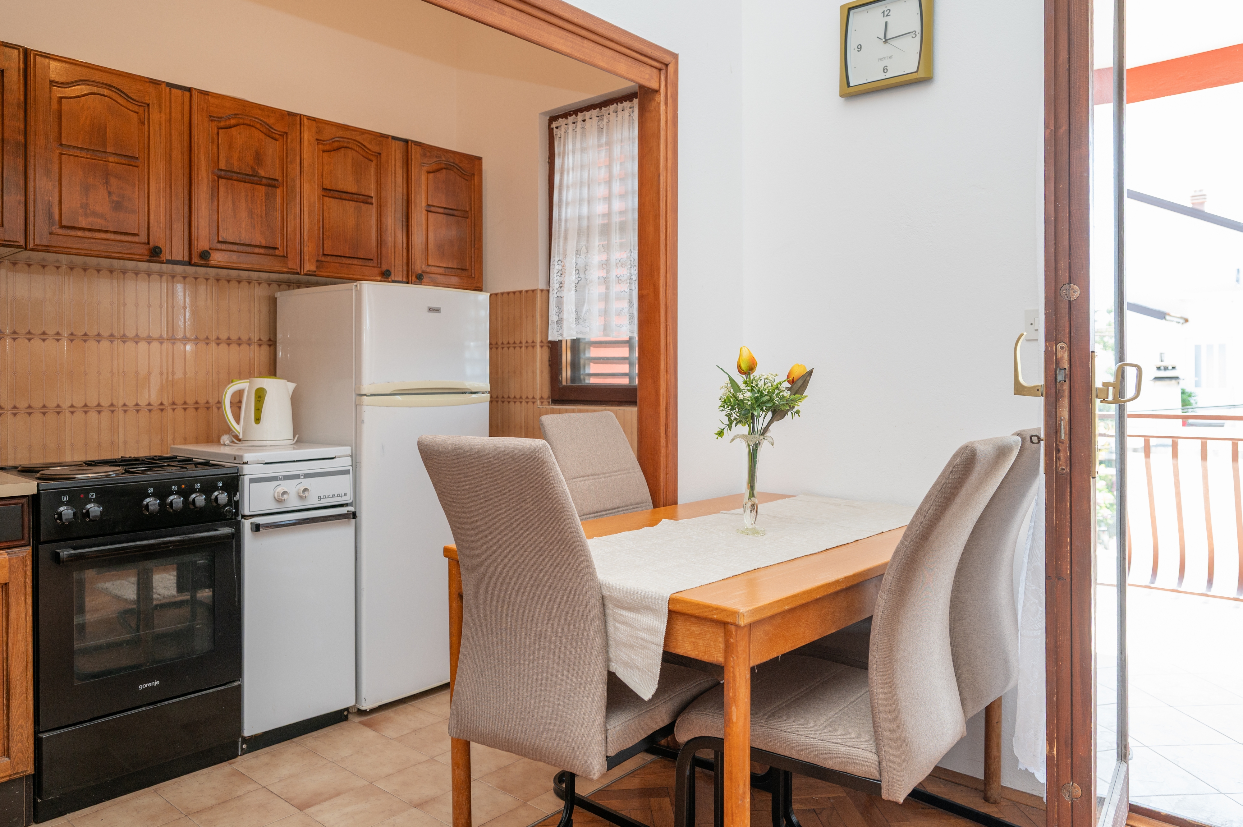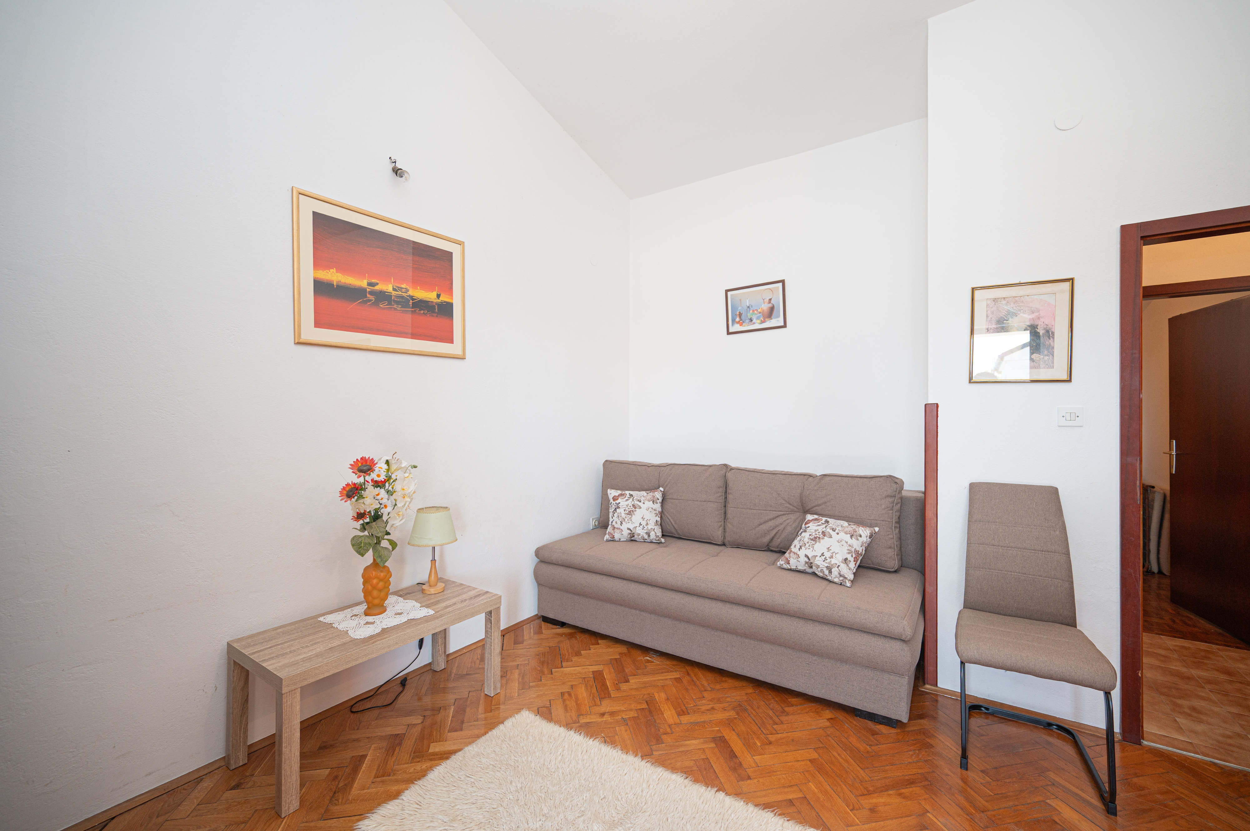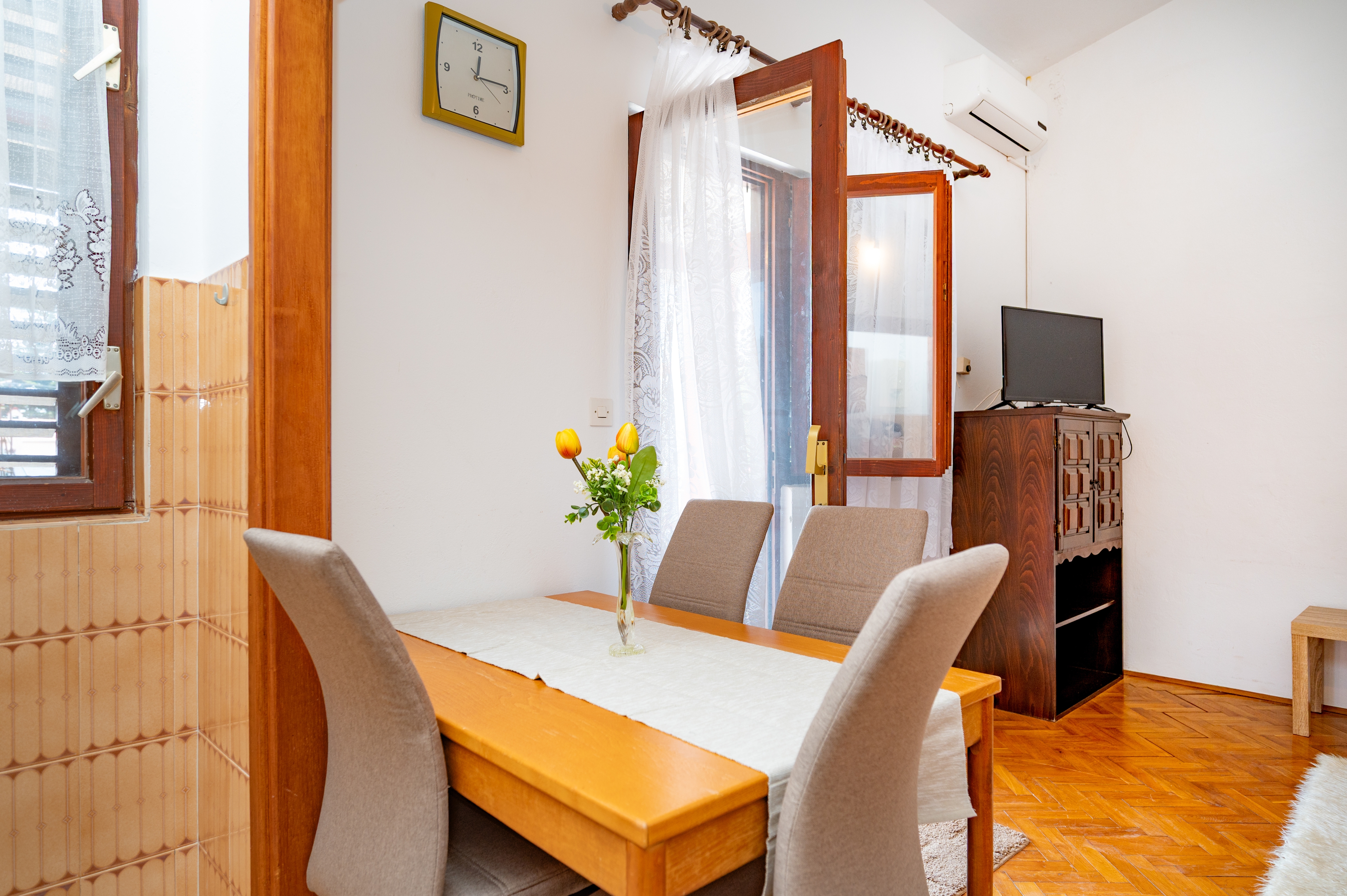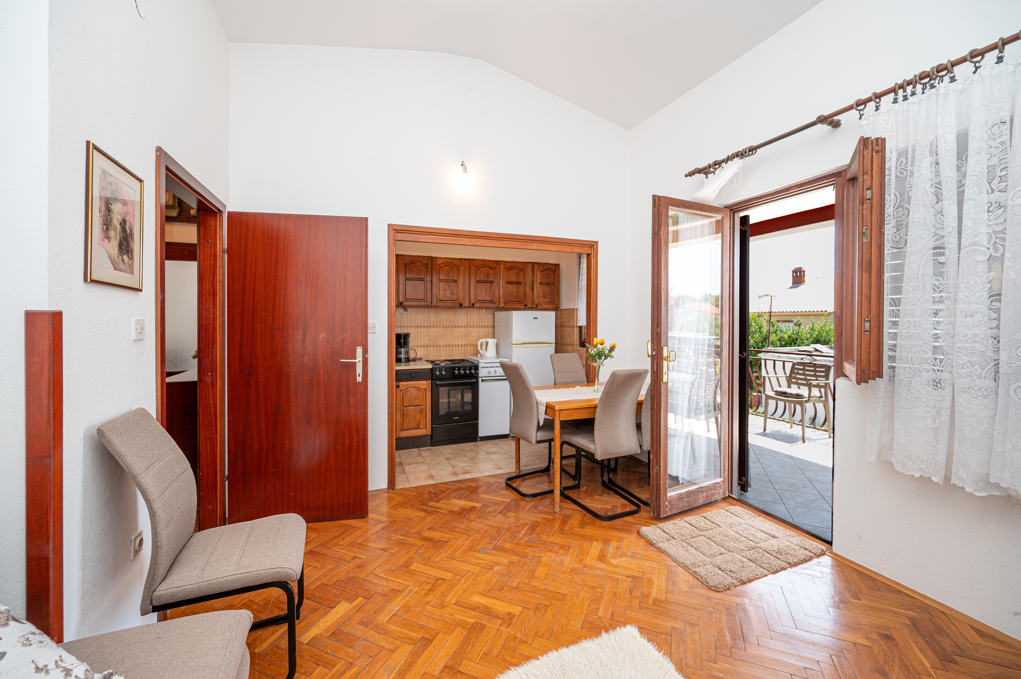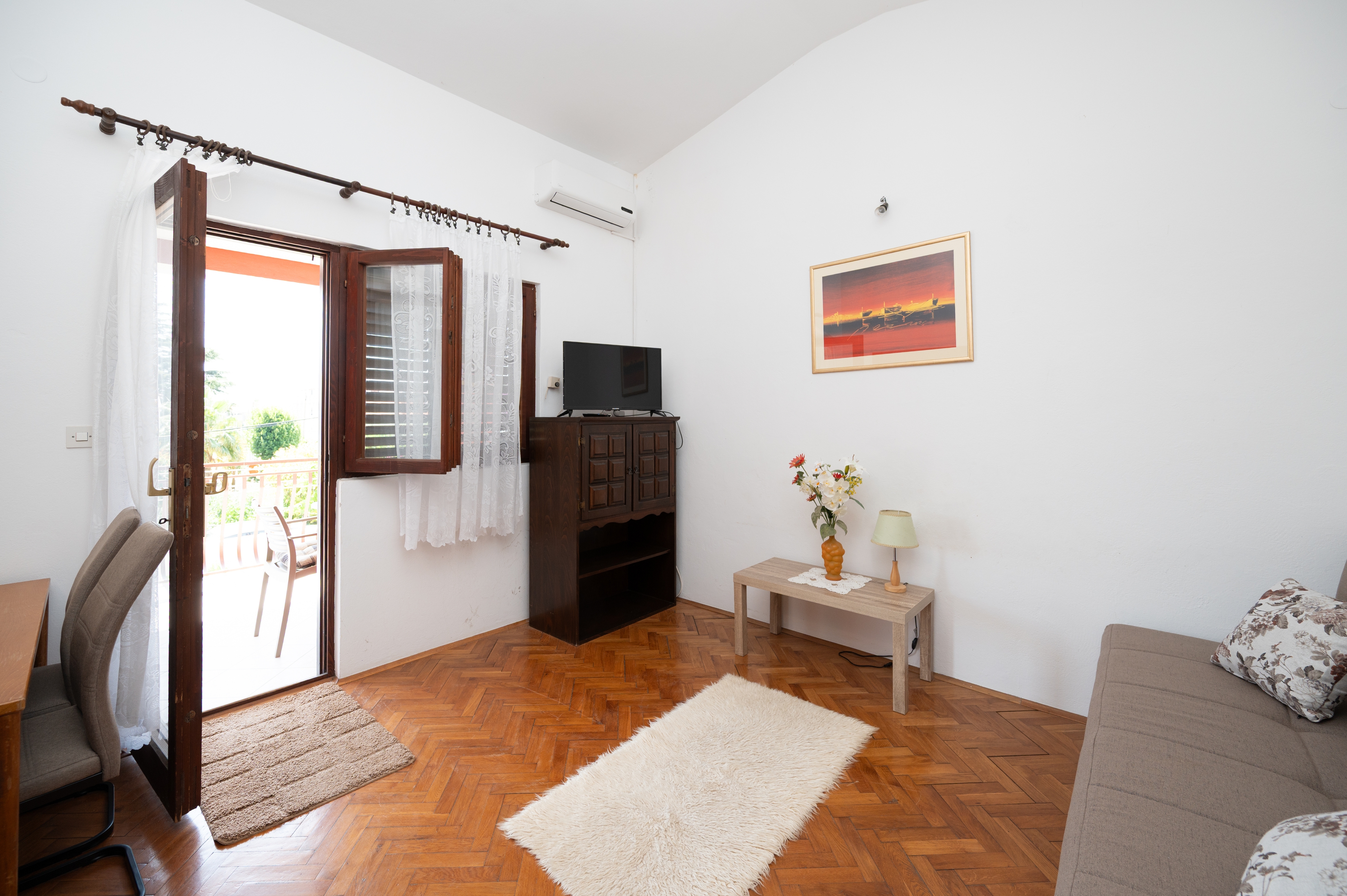 Apartment can accommodate 4 guests. Beds are situated in 1 sleeping rooms, but also in the living room, within 40m2. Guests can use a private terrace to enjoy the warm summer evenings. Food can be prepared using barbecue which is shared with other guests too. INCLUDED IN THE PRICE: tourist tax, final cleaning, air-conditioning, parking, internet, baby cot. OPTIONAL ADDITIONAL COSTS: additional bed (€10.00 per night). The availability of additional services for your chosen dates of stay, as well as their prices (if none are listed) must be checked ahead of time. Any additional services not shown in the price calculation are payable directly to the property owner and only if used by the visitor. Discounts to the base price: free day 14=13 (for reservations of 14 or more days you get one free day for the stay until 31122026).