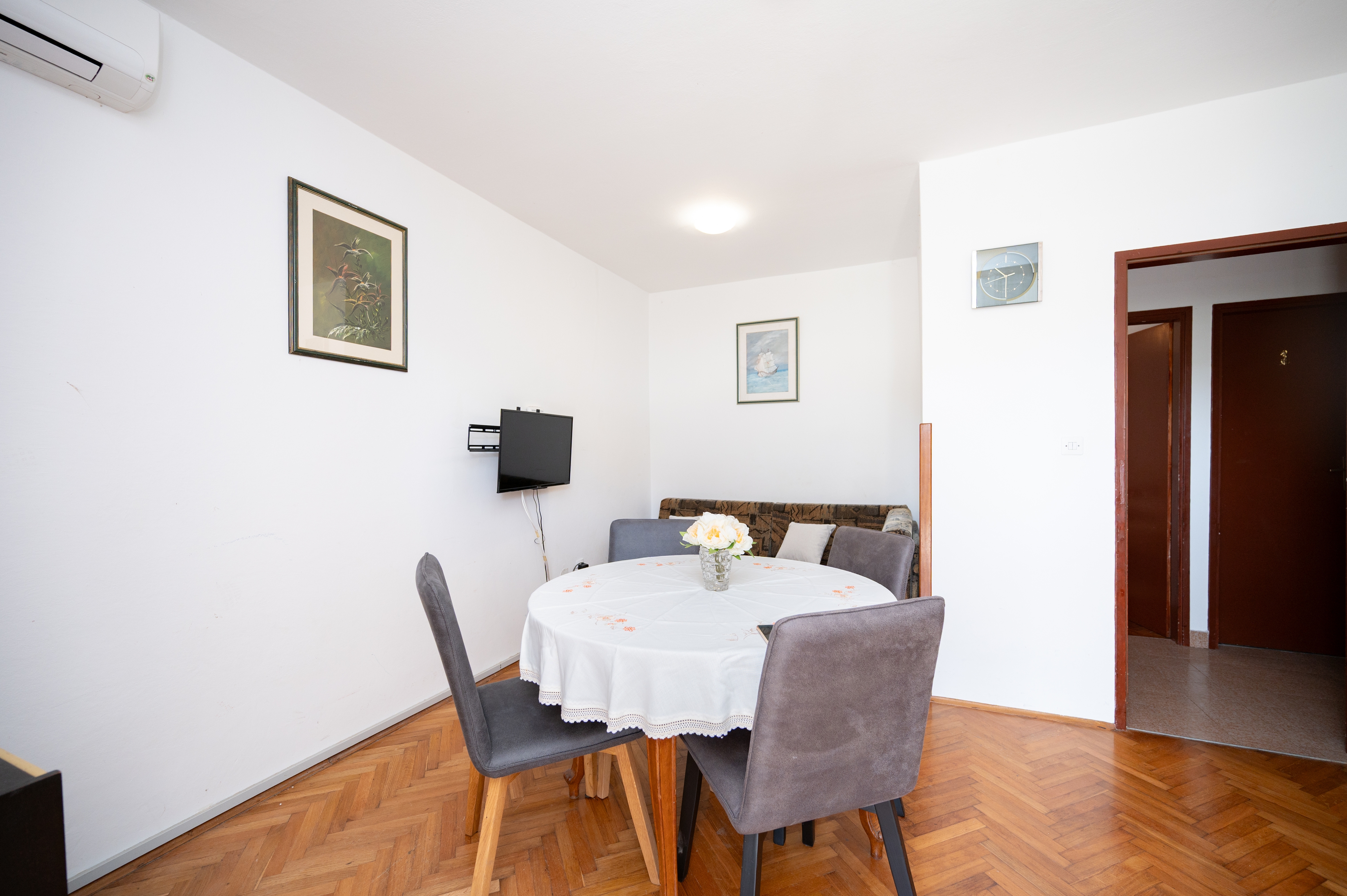 Apartment can accommodate 4 guests. Beds are situated in 1 sleeping rooms, but also in the living room, within 36m2. Guests can use a private terrace to enjoy the warm summer evenings. Food can be prepared using barbecue which is shared with other guests too. INCLUDED IN THE PRICE: tourist tax, final cleaning, air-conditioning, parking, internet, baby cot. OPTIONAL ADDITIONAL COSTS: additional bed (€10.00 per night). The availability of additional services for your chosen dates of stay, as well as their prices (if none are listed) must be checked ahead of time. Any additional services not shown in the price calculation are payable directly to the property owner and only if used by the visitor. Discounts to the base price: free day 14=13 (for reservations of 14 or more days you get one free day for the stay until 31122026).
